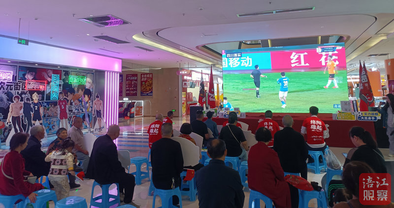 在江油市圣名購物廣場負(fù)一樓大潤發(fā)超市的顧客休息區(qū),提前設(shè)置好的大屏幕和觀看席吸引了眾多消費(fèi)者和球迷駐足,一同觀看這場比賽實(shí)況轉(zhuǎn)播,為綿陽健兒加油?,F(xiàn)場裝飾著足球模型、綿陽隊(duì)隊(duì)旗和加油標(biāo)語,烘托出熱烈的觀賽氛圍。