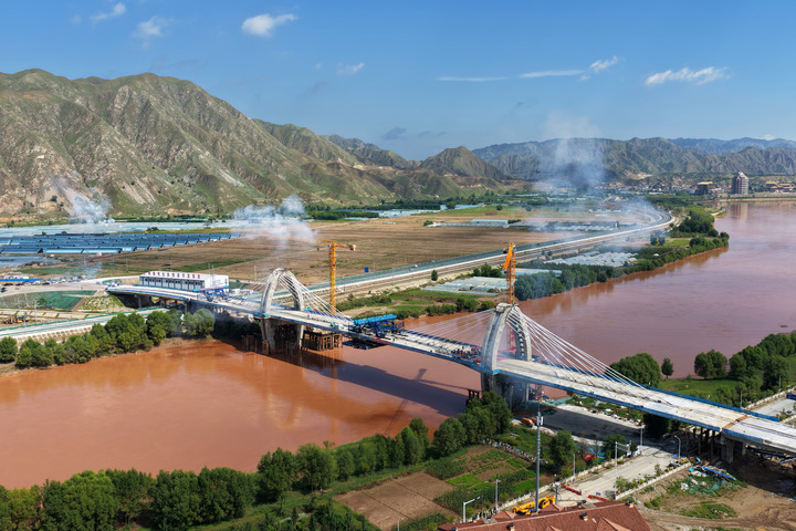 8月29日拍攝的蘭州什川黃河大橋順利完成中跨合龍(無(wú)人機(jī)照片)。(蘭州市委宣傳部供圖)