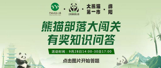 操作流程:微信搜索綿陽(yáng)熊貓分局→服務(wù)→國(guó)家公園→知識(shí)問(wèn)答,答對(duì)7道題即有機(jī)會(huì)抽取定制熊貓伴手禮套裝、熊貓水杯等。