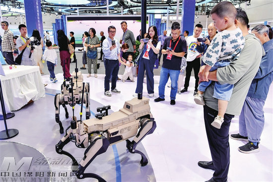 9月27日,在第十三屆中國(綿陽)科博會上,兩臺機(jī)器狗吸引觀眾圍觀。