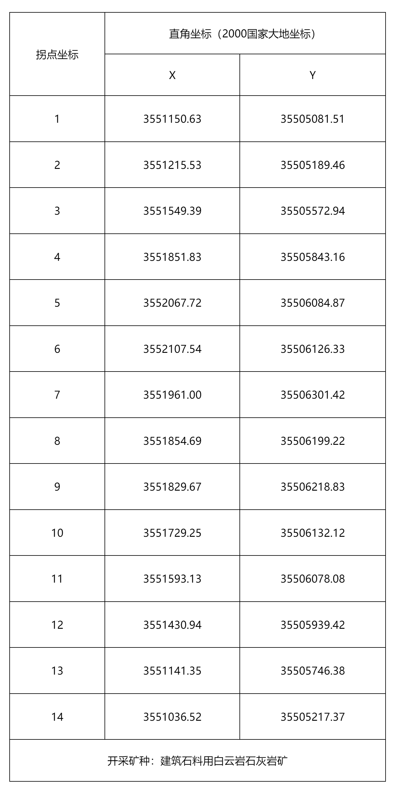 由14個拐點坐標圈閉(見下表),礦區(qū)總面積:0.448平方公里,開采標高:+1029m至+825m
