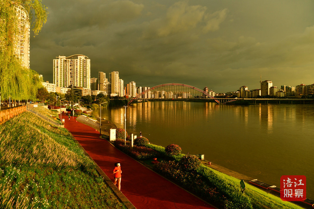 7月22日早上6時(shí)許,初升的太陽(yáng)從東方冉冉升起,一時(shí)間霞光萬(wàn)丈,把綿陽(yáng)城區(qū)三江湖兩岸的樓宇、樹木、健身步道染上了一層金黃色,與短暫出現(xiàn)的彩虹相映成景,美不勝收。[
