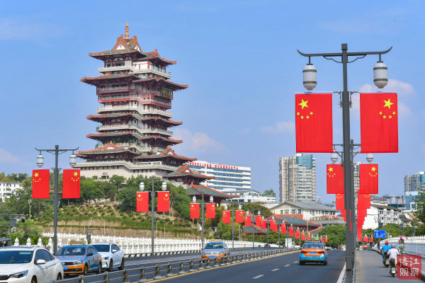 國(guó)慶將至,綿陽(yáng)城區(qū)虹云橋、南河大橋、南山大橋、富樂大橋、東方紅大橋、東原大橋等橋梁上都懸掛上了鮮艷奪目的五星紅旗。[