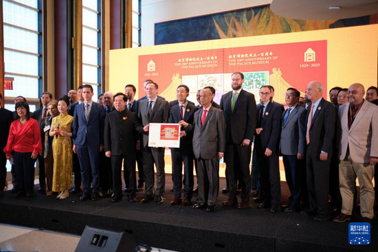 5月19日,在位于紐約的聯(lián)合國總部,嘉賓展示“故宮博物院成立100周年”特別事件郵票版張。 “生生不息——故宮文創(chuàng)走進(jìn)聯(lián)合國主題展”開幕式暨故宮博物院成立100周年郵票發(fā)布儀式19日在聯(lián)合國總部舉行,120余位各國駐聯(lián)合國大使及國際組織代表參加。[