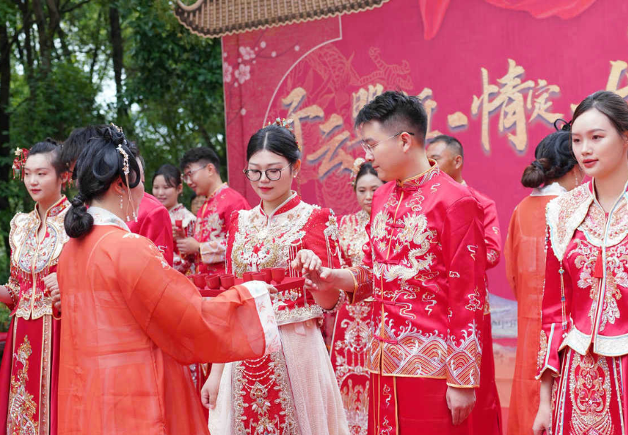 撒喜豆、沃盥禮、合巹禮、結(jié)發(fā)禮……8月28日,在綿陽市西山公園子云亭下,“子云盟誓·情定西山”紅色背景板鮮艷奪目,20對新人以簡約而莊重的儀式,踐行婚俗新風(fēng),開啟婚姻幸福新篇章。[