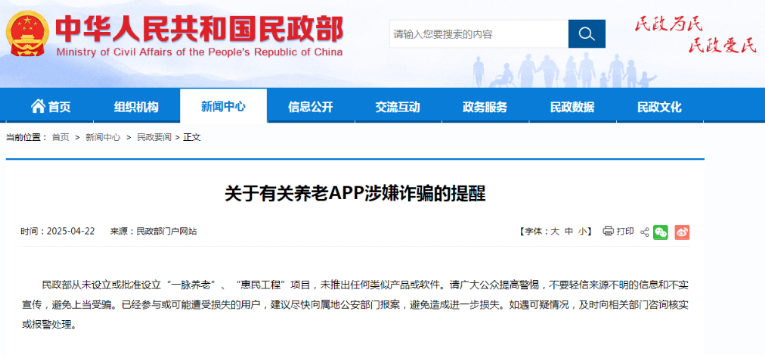 民政部發(fā)布有關(guān)養(yǎng)老APP涉嫌詐騙的提醒