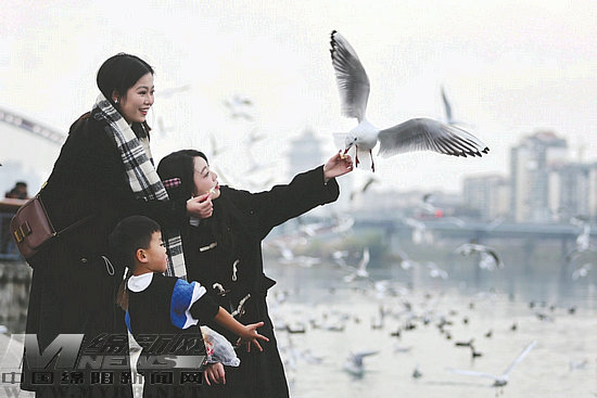 1月8日,在綿陽三江湖國家濕地公園,成群的紅嘴鷗翩翩起舞,與市民親密互動?!拔液芟矚g走在江邊的感覺,很舒適,很愜意?!睆某啥紒砭d陽游玩的代佳靈說。[